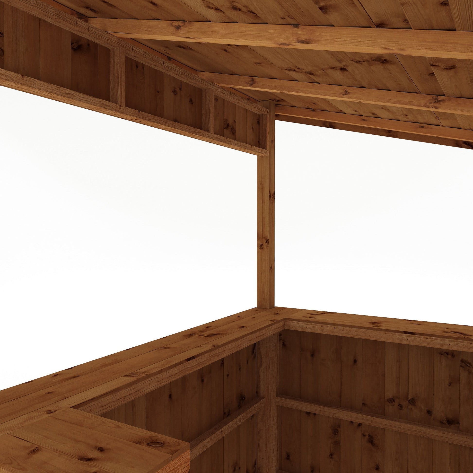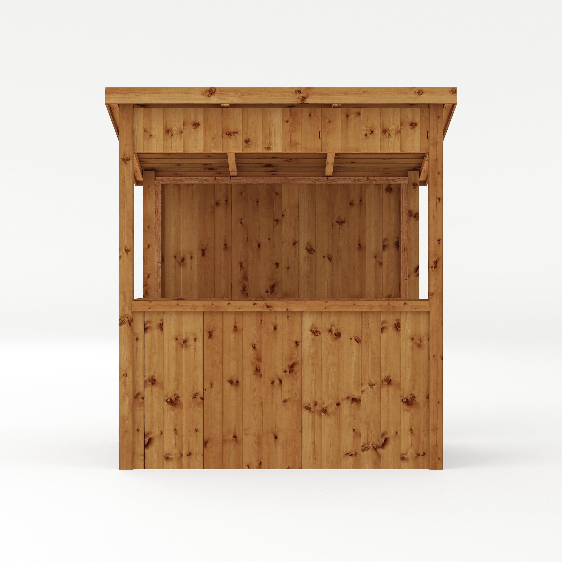 The Pressure Treated Garden Bar is expertly crafted in the UK using 12mm tongue and groove boards, reinforced with a sturdy 44mm x 44mm frame. This construction method not only ensures durability and strength, but also presents an appealing aesthetic. The roof is made from overlapping timber boards that are securely attached to an internal frame. The modern pent design allows rainwater to easily drain off the back of the bar, keeping the interior dry and preventing any water accumulation.