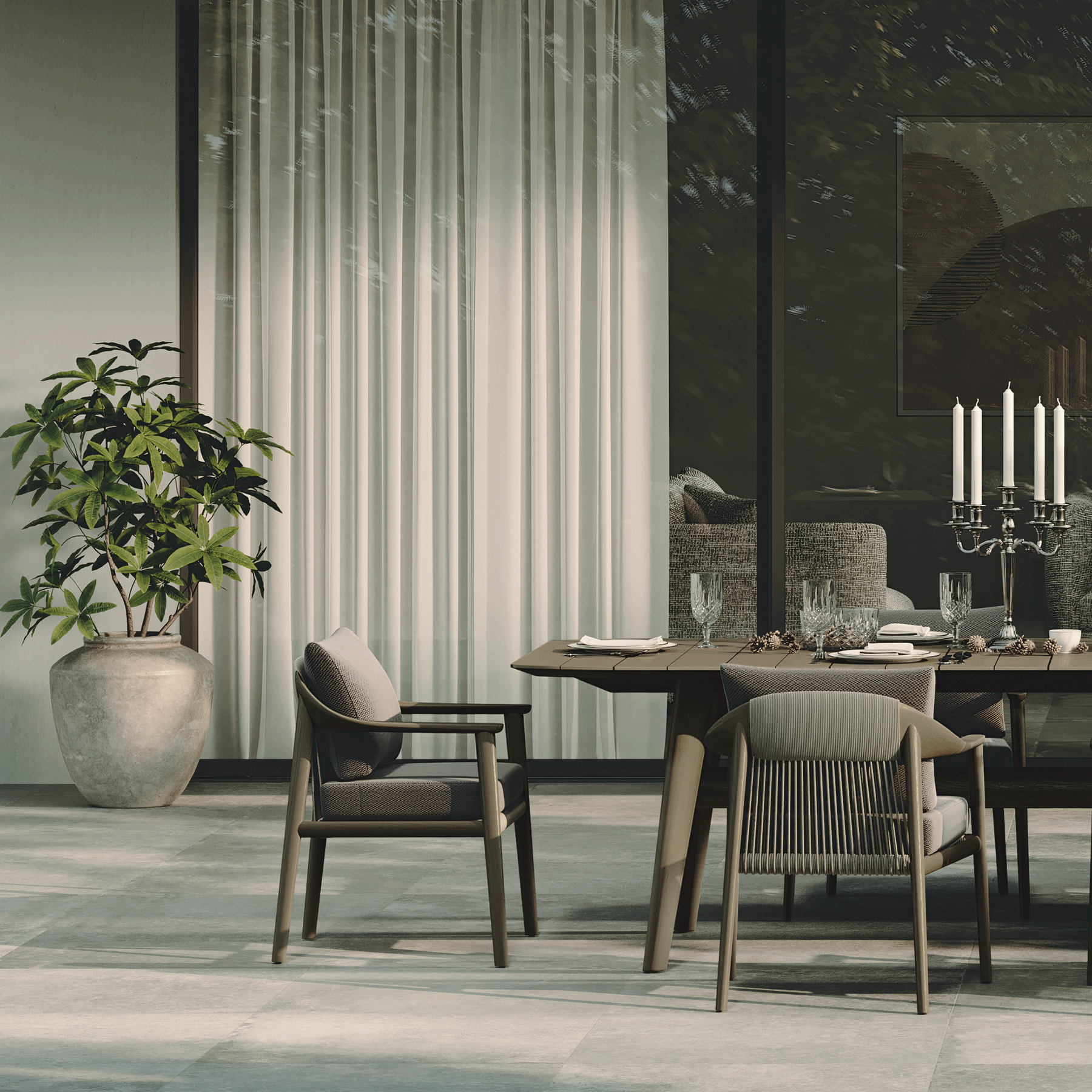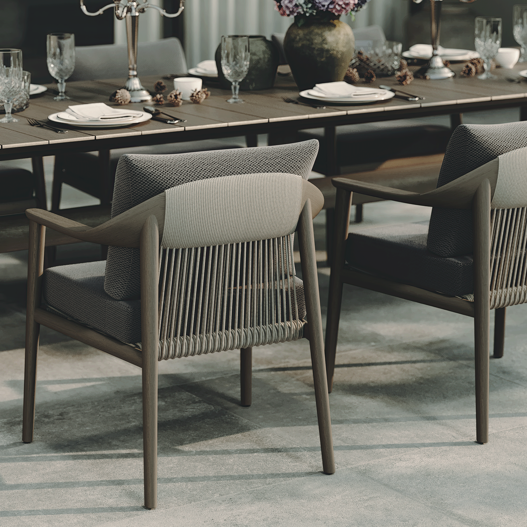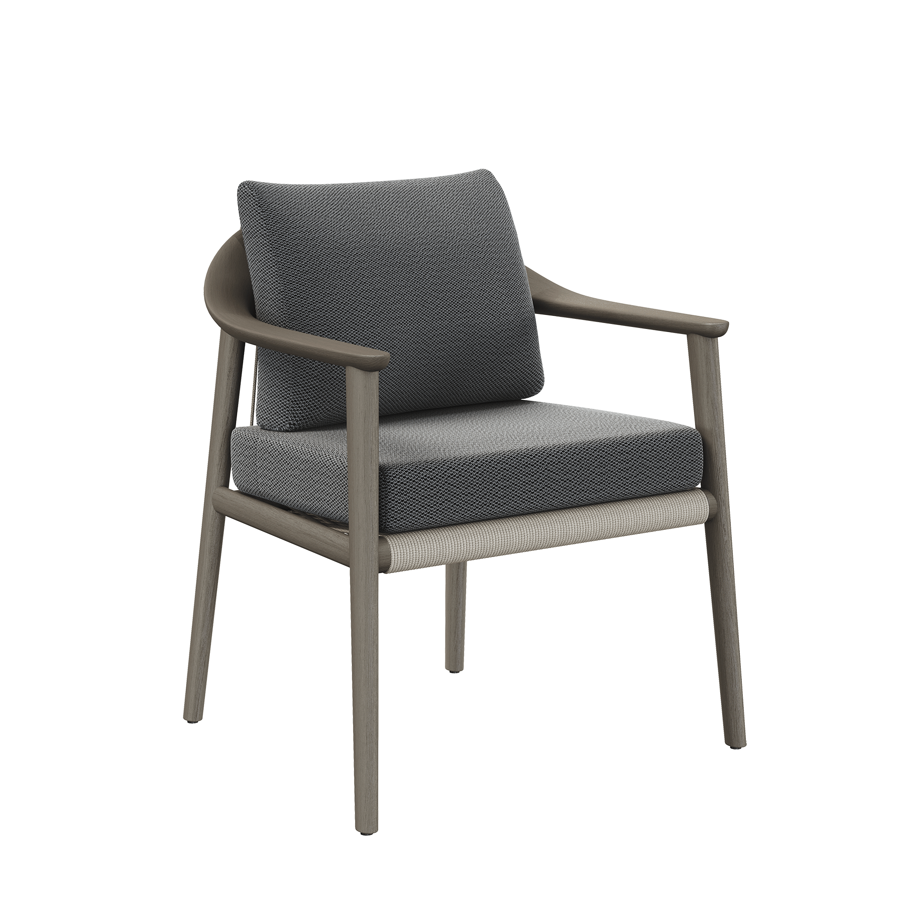 The chair is upholstered with the sophisticated Coal Textured Wave fabric which is both durable and comfortable. The back cushion, expertly tailored to fit the seat, provides a welcoming embrace, ensuring leisurely dining experiences that linger in memory. Equipped with quick dry foam cushions, this chair provides comfort, support, perfect for dining and a durability suitable for all weather conditions.