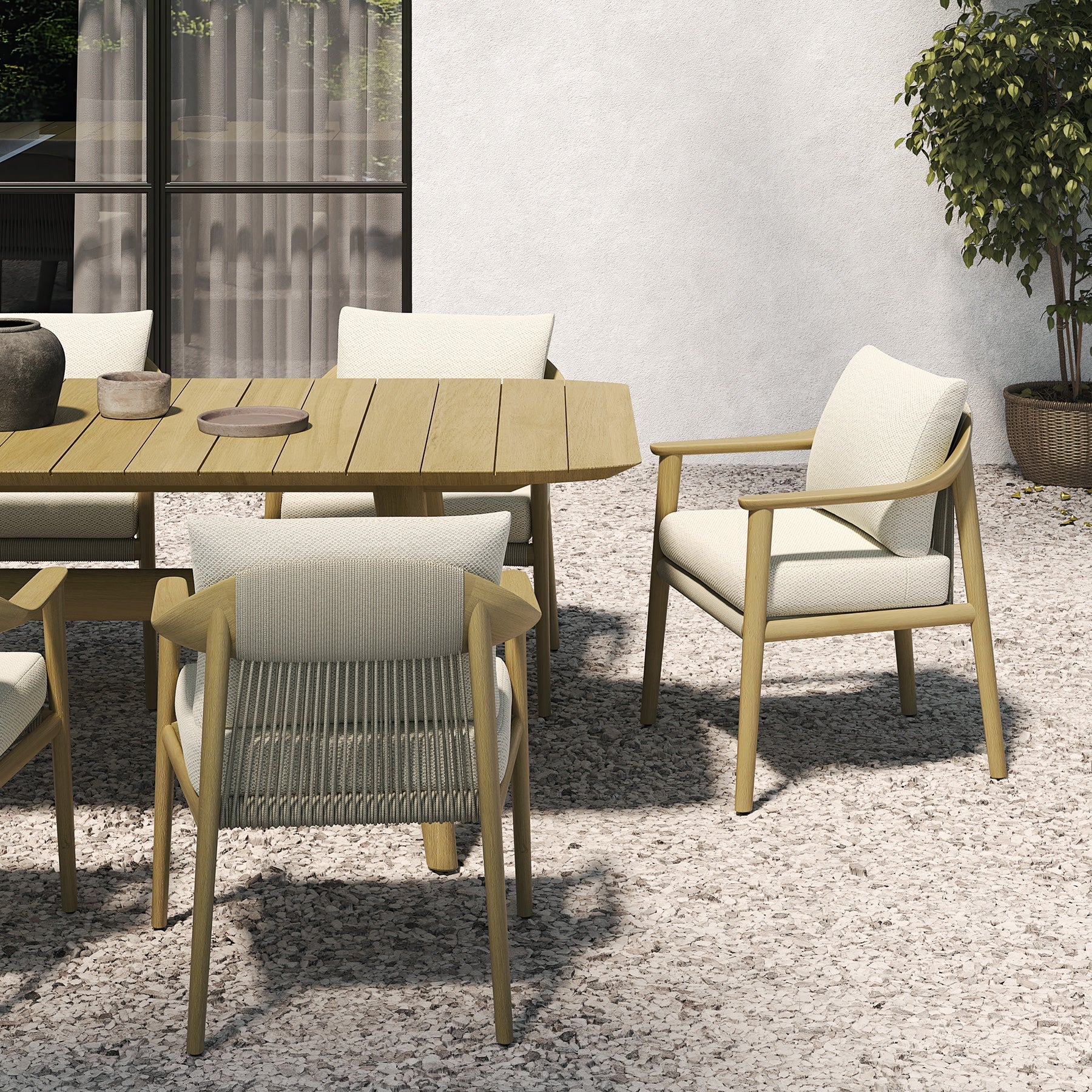 The seat and backrest are adorned with cushions in the Oatmeal Textured Weave fabric, a combination that not only complements the airy coloration of the frame but also offers a serene visual harmony. This fabric boasts enduring quality and its ability to withstand the British elements while providing the utmost comfort. Whether hosting a sunset soiree or enjoying a quiet morning repast, the N1 Dining Chair is a testament to tasteful outdoor living, inviting a sense of calm sophistication to any gathering.