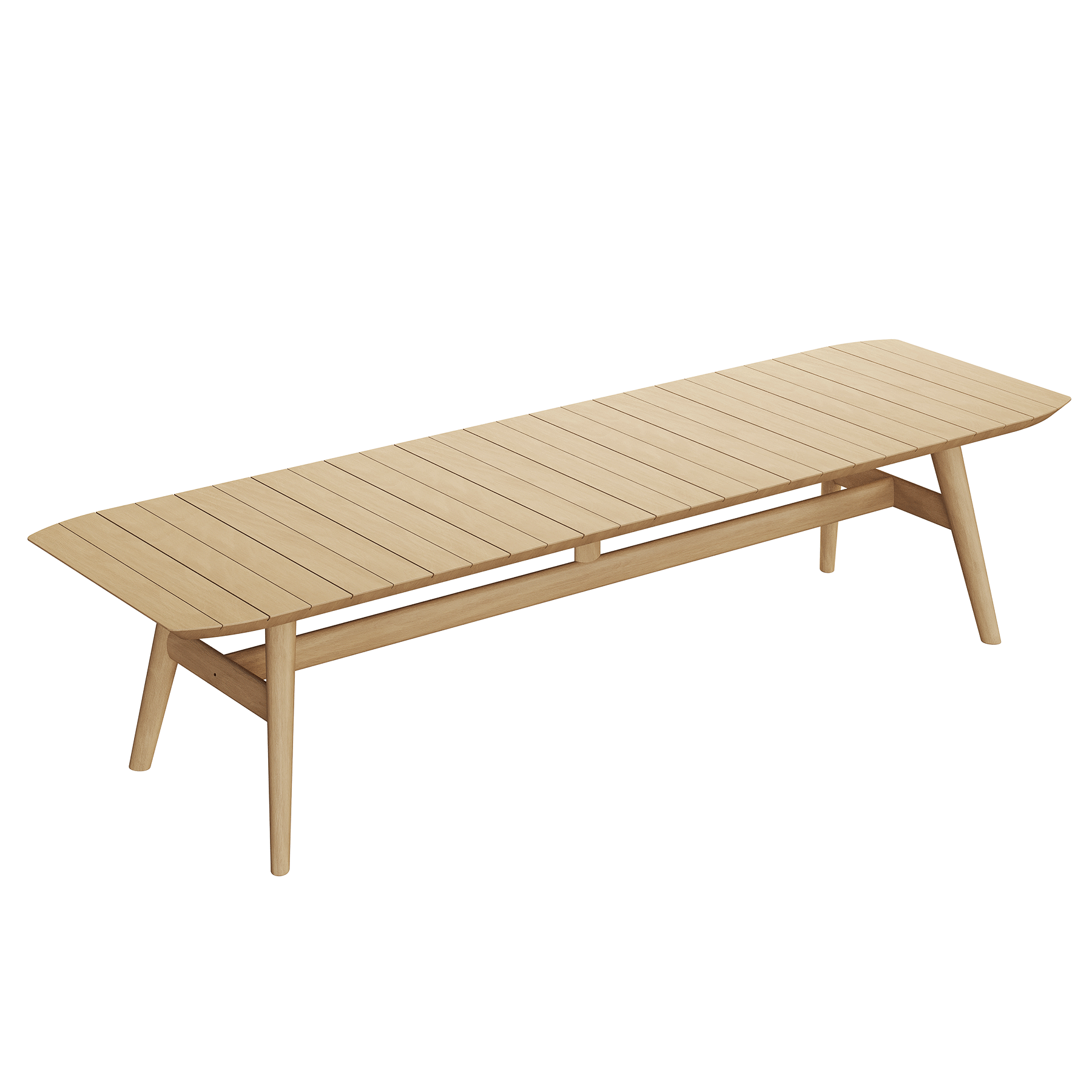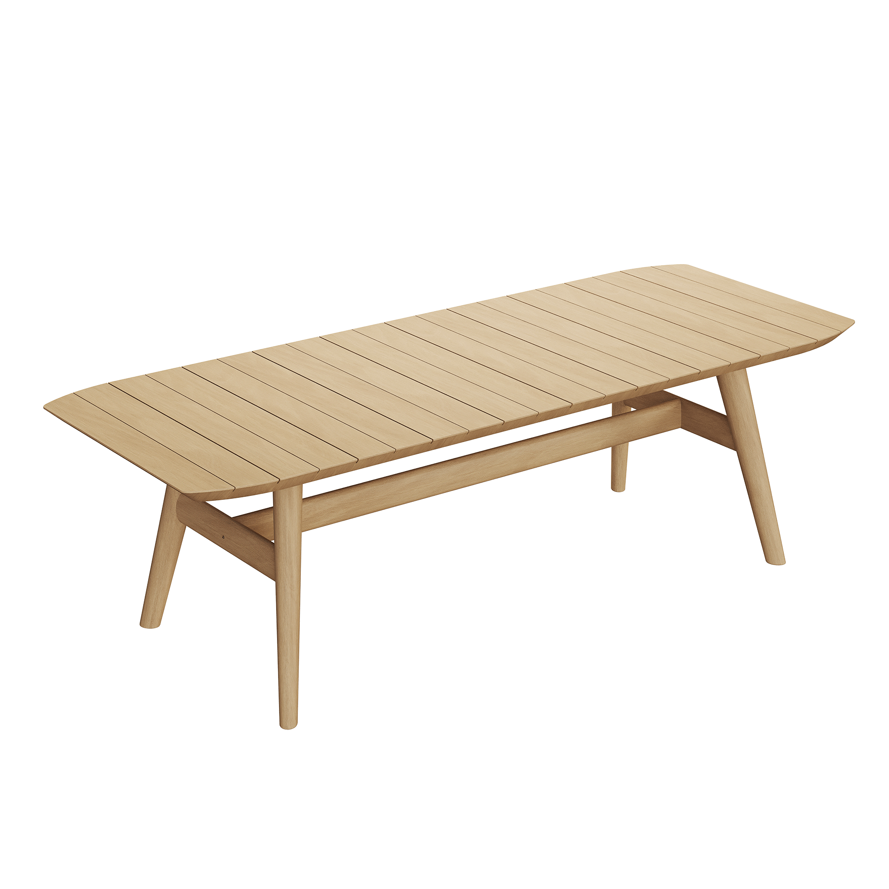 The table's silhouette is harmonious of form and function, its sleek and angular legs supporting a surface that is both expansive and welcoming. The slatted top, reminiscent of classic style, allows for a play of light and air, adding an element of tactile pleasure to the visual grace. Each gathering at this table promises to be bathed in the warmth of natural wood, set against the backdrop of the open air, making it an ideal stage for memorable alfresco dining experiences.
