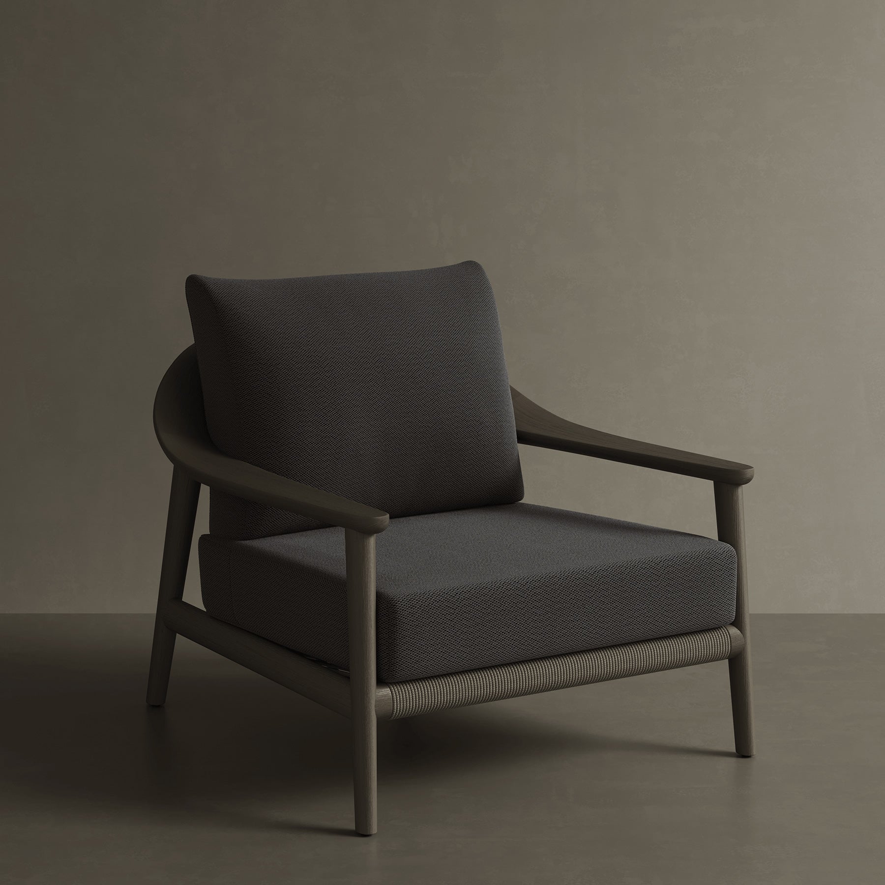 Upholstered in Coal Textured Weave fabric, the cushioning provides an indulgent seat that is sumptuous and supportive. The materials depth and intricate weave catches the eye, offering a visual and tactile richness that is unparalleled. The rear rope detail is a thoughtful touch of artisanal finesse and speaks of the meticulous attention to detail that characterises the collection. This lounge chair is a sanctuary of relaxation, designed to elevate any outdoor space with its luxurious comfort and impeccable style.