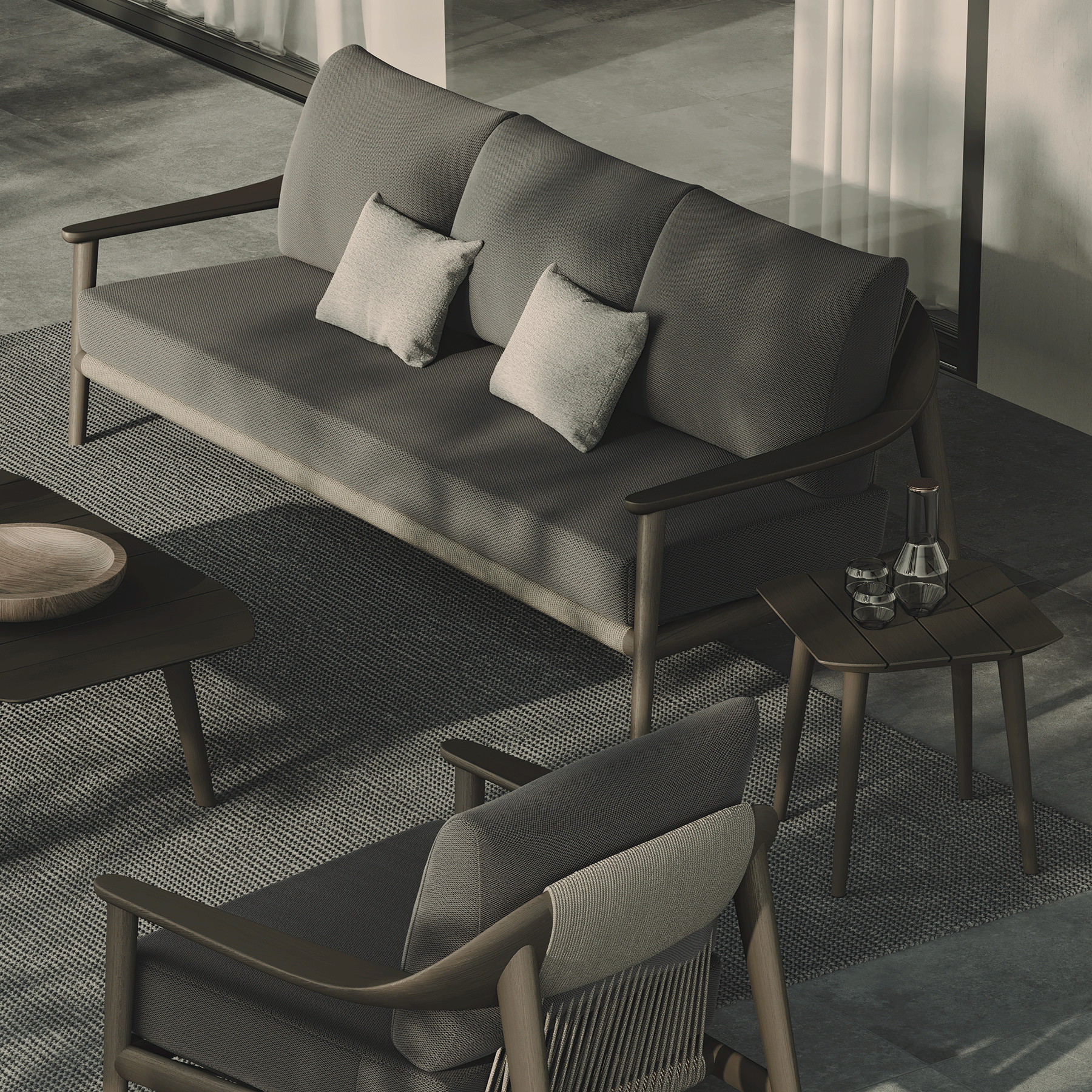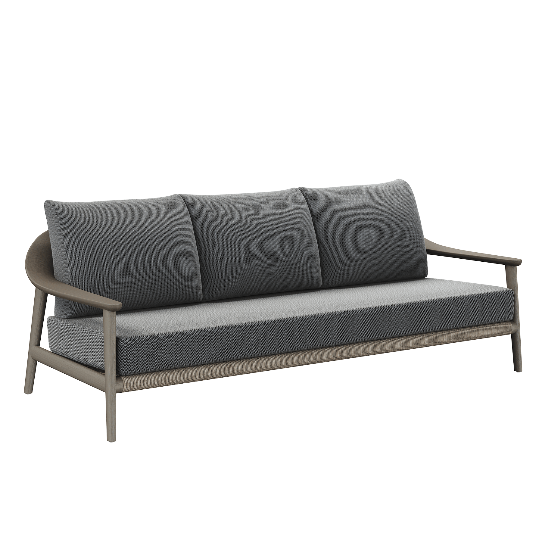 The sofa seat is made up of cushions upholstered in the collection's signature Coal Textured Weave fabric, presenting a robust yet refined seating experience. This fabric's textural beauty and enduring quality, harmonises with the teak to create a visual and sensory indulgence. Sophisticated simplicity, this sofa from the N1 Collection is a statement of design and an enduring investment in your outdoor living.