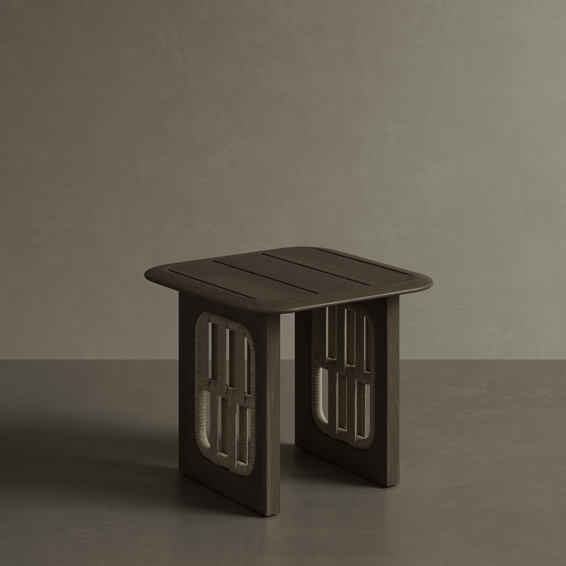 The N2 Side Table epitomises artisanal charm and contemporary design, making it a welcome addition for the outdoor spaces curated by the most discerning individuals. Finished in darkened teak, this side table is an exhibition of craftsmanship, where the natural allure of intricately carved teak meets the modern sophistication of visually and texturally contrasting handwoven panels. The result is a piece that stands out as a sculptural work of art.