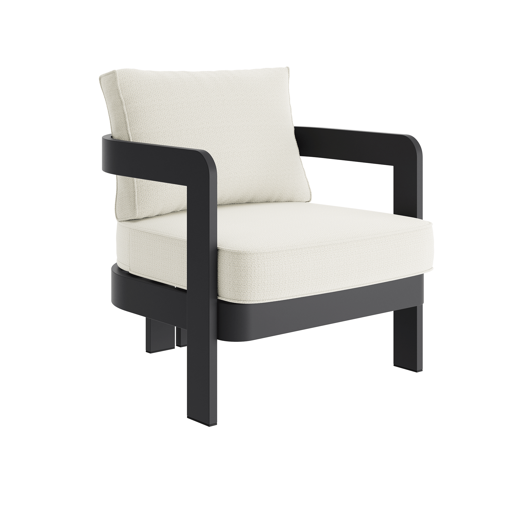 The N3 collection pays homage to the modern concept of proportion and architectural intricacy. The N3 lounge chair is meticulously constructed from robust aluminium with a Kohl powder coated finish that is extremely durable in a multitude of weathers and scenarios. Its unique tripod shape, has a gracefully curved backrest, accompanied by two supporting front legs and and almost concealed rear leg with a subtle enchanting split plane detail visible from behind.