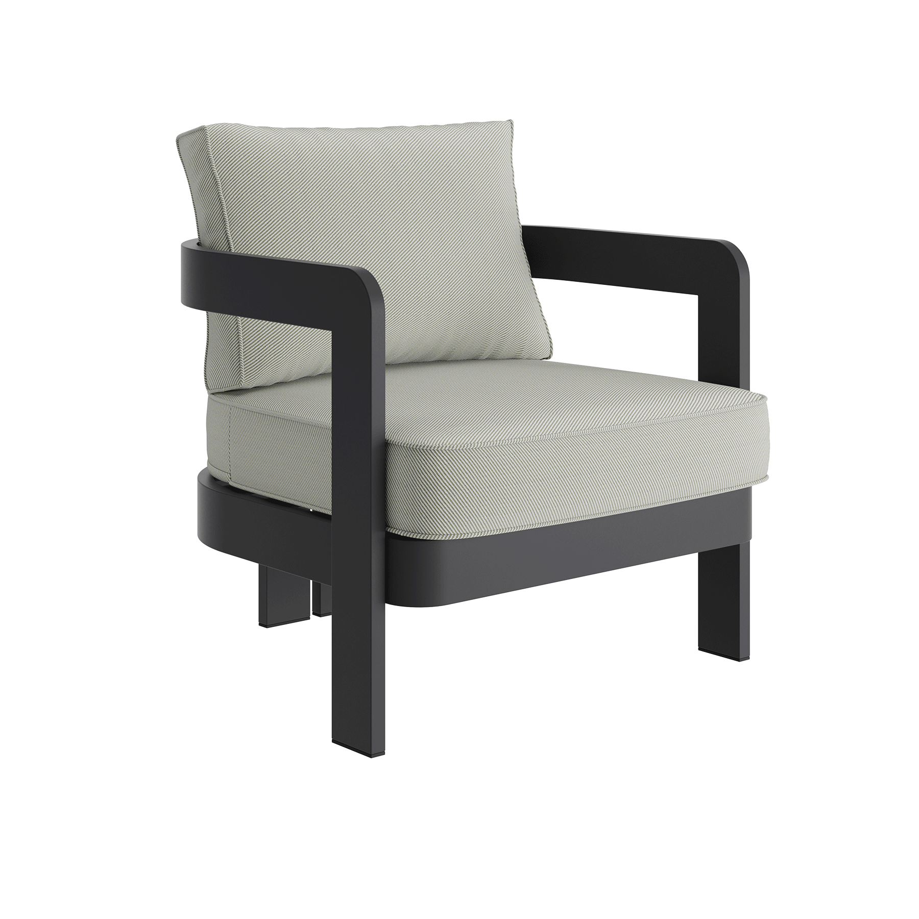 The N3 collection pays homage to the modern concept of proportion and architectural intricacy. The N3 lounge chair is meticulously constructed from robust aluminium with a Kohl powder coated finish that is extremely durable in a multitude of weathers and scenarios. Its unique tripod shape, has a gracefully curved backrest, accompanied by two supporting front legs and and almost concealed rear leg with a subtle enchanting split plane detail visible from behind.