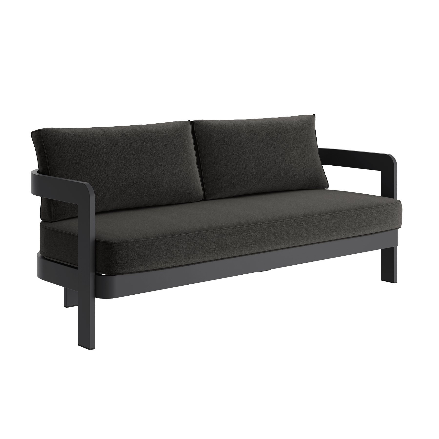 The N3 collection pays homage to the modern concept of proportion and architectural intricacy. The N3 Sofa is meticulously constructed from robust aluminium with a Kohl powder coated finish. Its clean lines are juxtaposed with its gracefully curved backrest, accompanied by two supporting side legs and and two subtle legs at the rear.