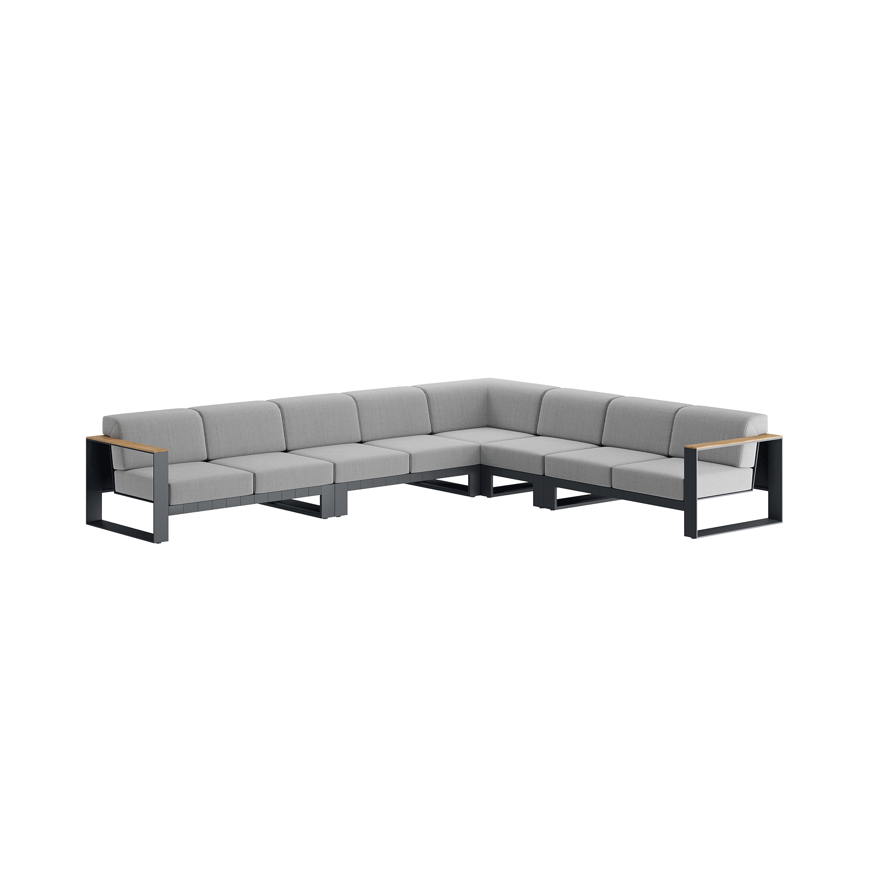The N5 Collection's modular corner sofa is available in configurations to seat six or eight people. The sofa's frame is sculpted from dark grey powder coated aluminium, its finish is a statement of contemporary sophistication that provides a striking contrast against the natural elements. The natural untreated teak detailing on the armrests adds a touch of warmth, their golden hues and smooth grain offering an organic reprieve within the chair's bold structure.