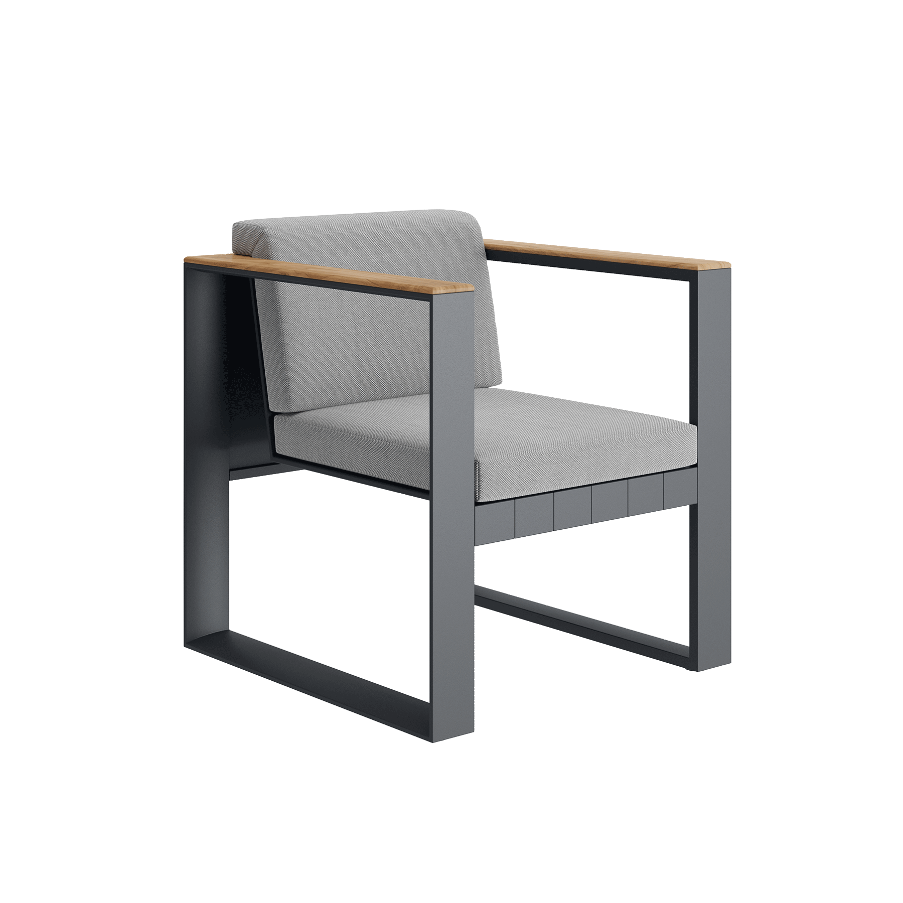 The Dining Chair from the N5 collection features a dark grey powder coated aluminium frame that provides a sleek and contemporary profile, its matte finish offering a striking contrast against the warm tones of the teak armrests. The fusion of these materials speaks a philosophy of harsh industrial design juxtaposed with calm organic values.