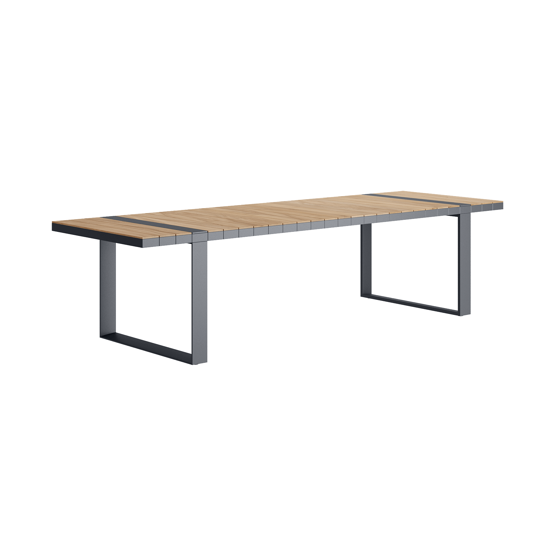 The N5 Dining Table is available in six or eight seater options and are a fusion of robust functionality and sleek design. These tables feature a striking contrast of dark grey powder coated aluminium frames against the natural beauty of natural untreated teak slats, creating a modern aesthetic that is both bold and inviting. The linear silhouette of the frame lends a contemporary edge, while the warmth of the teak introduces an organic touch.