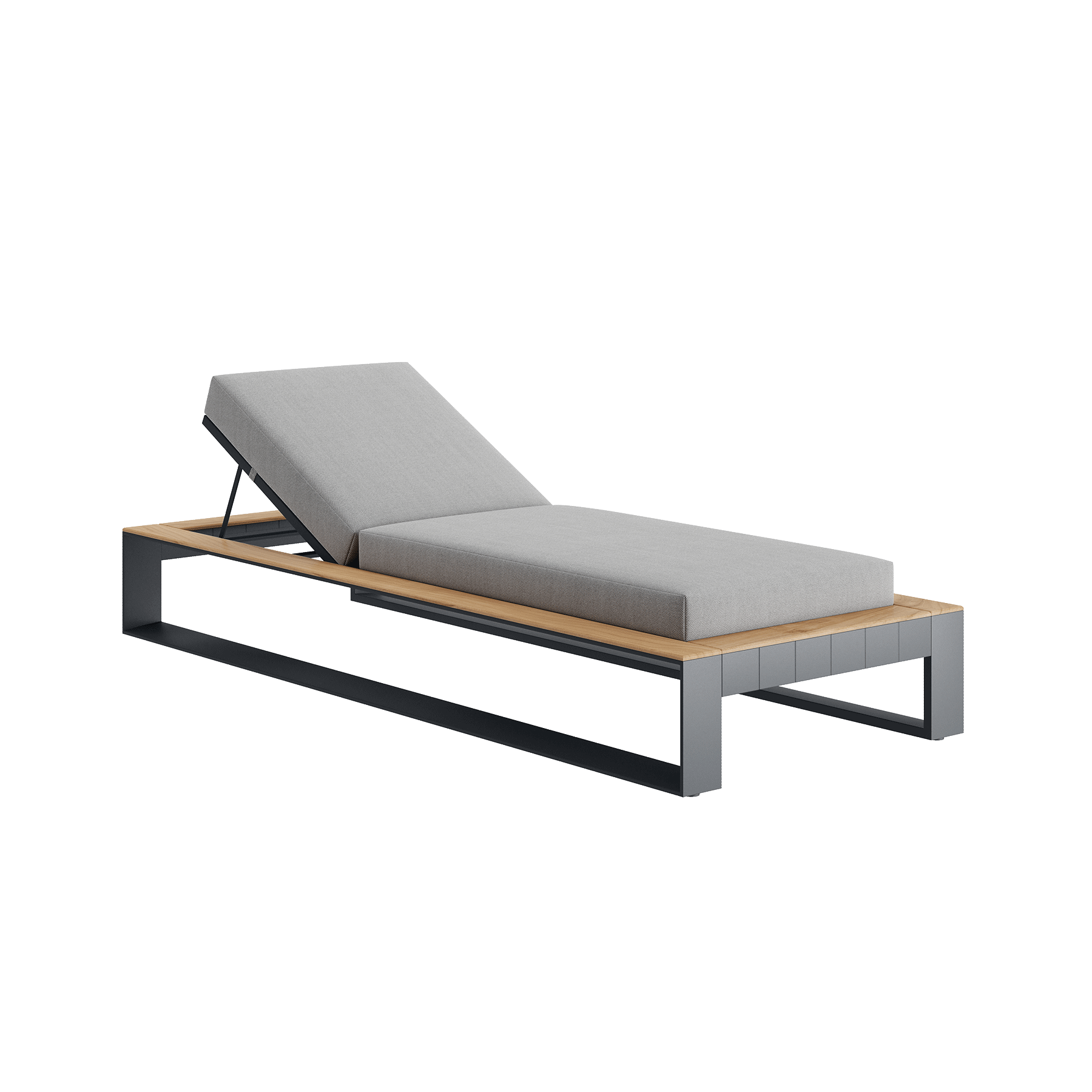 The N5 Collection Sun Lounger showcases a sleek, dark grey powder coated aluminium frame, providing a sturdy yet elegant base that contrasts beautifully with the natural warmth of the untreated teak detailing. The streamlined silhouette of the frame offers a industrial architectural look, while the teak adds a touch of timeless luxury that appeals to the discerning eye.