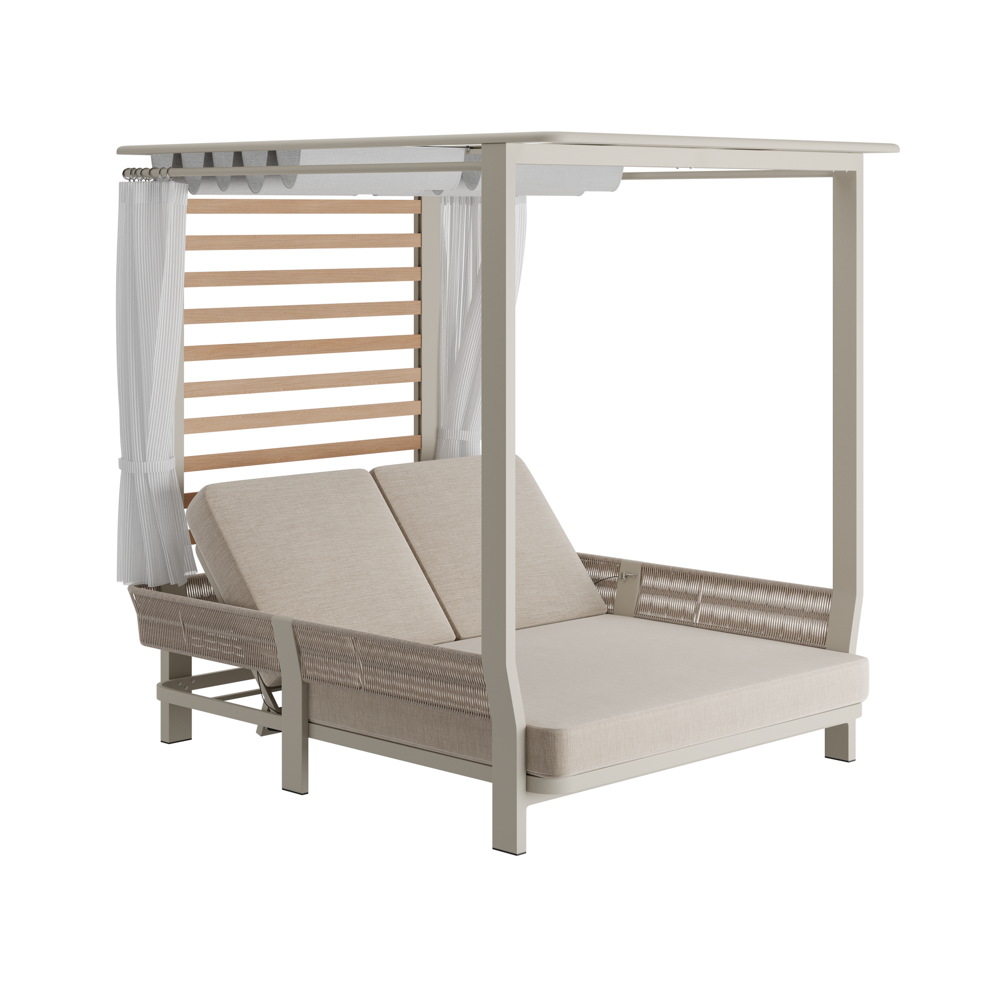Intended to perfectly embrace summer moments or for entertaining by the poolside the N7 Collection Day Bed is a versatile garden piece. Its contemporary elegance is executed through its varied use of materials and textures. The bed has a low profile powder-coated aluminium frame that extends to a delicate retractable canopy above with elegant sheer curtain sides providing privacy. The frame's neutral hue perfectly complements the warm, natural tones of the natural teak horizontal slat detailing. A hand-woven rope detail encircles the bed frame, adding beautiful texture. This spacious two person bed has dual adjustable backrests allowing you to recline as you choose encouraging deep relaxation as you sink into the Natural Weave fabric covered cushions - ideal for sharing an intimate morning coffee or wine and laughter in the evening twilight.