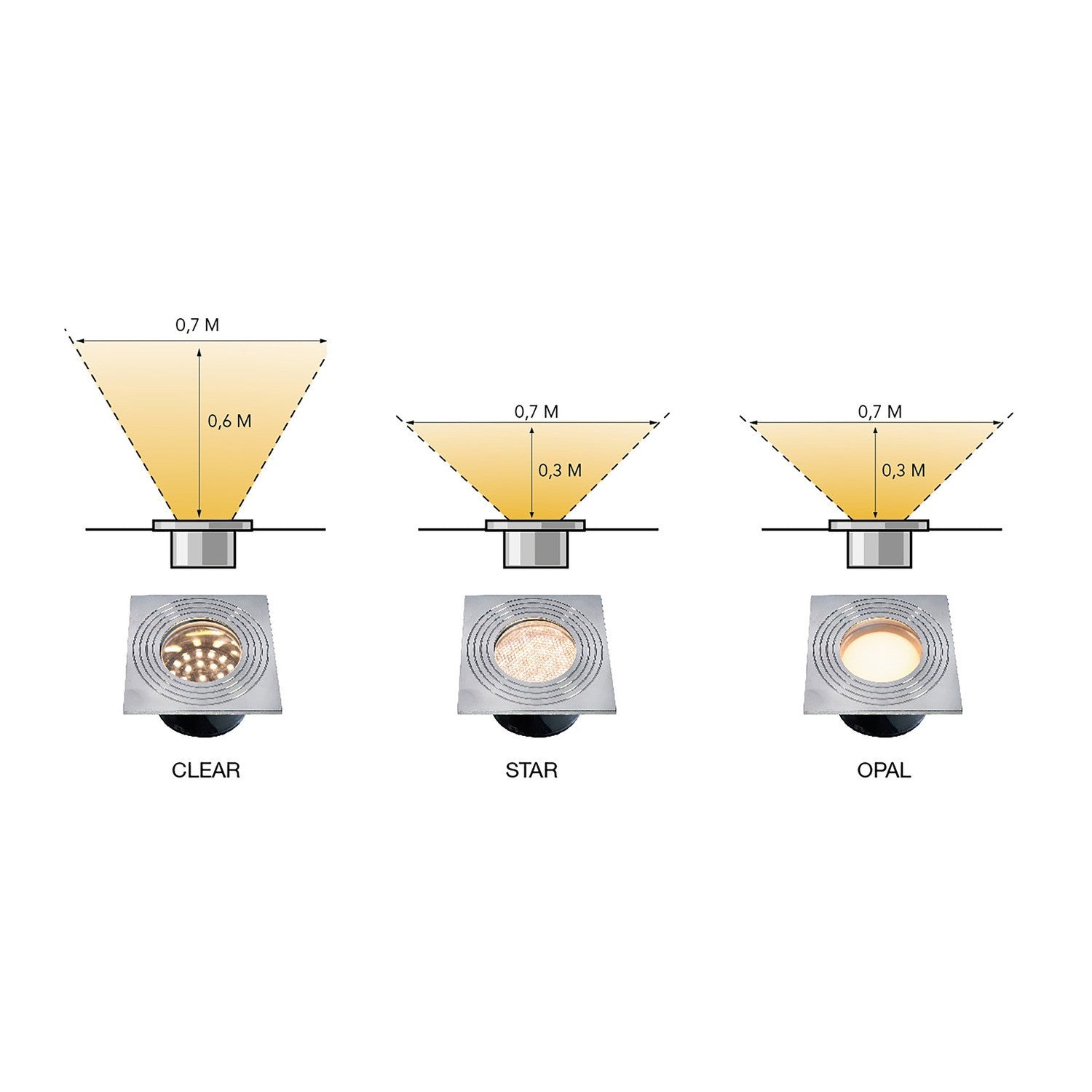 This Onyx Decking Light is a versatile and stylish addition to any outdoor space. With a warm, white light source and minimal power consumption of 1W, this light is perfect for accent lighting. Made of high-quality stainless steel and measuring 7.5 cm by 7.5 cm, it is durable and sleek. The standard milk glass insert provides a warm, white color, but for a customizable effect, the included honeycomb insert can be easily inserted. Choose the glass that best suits your desired lighting effect.