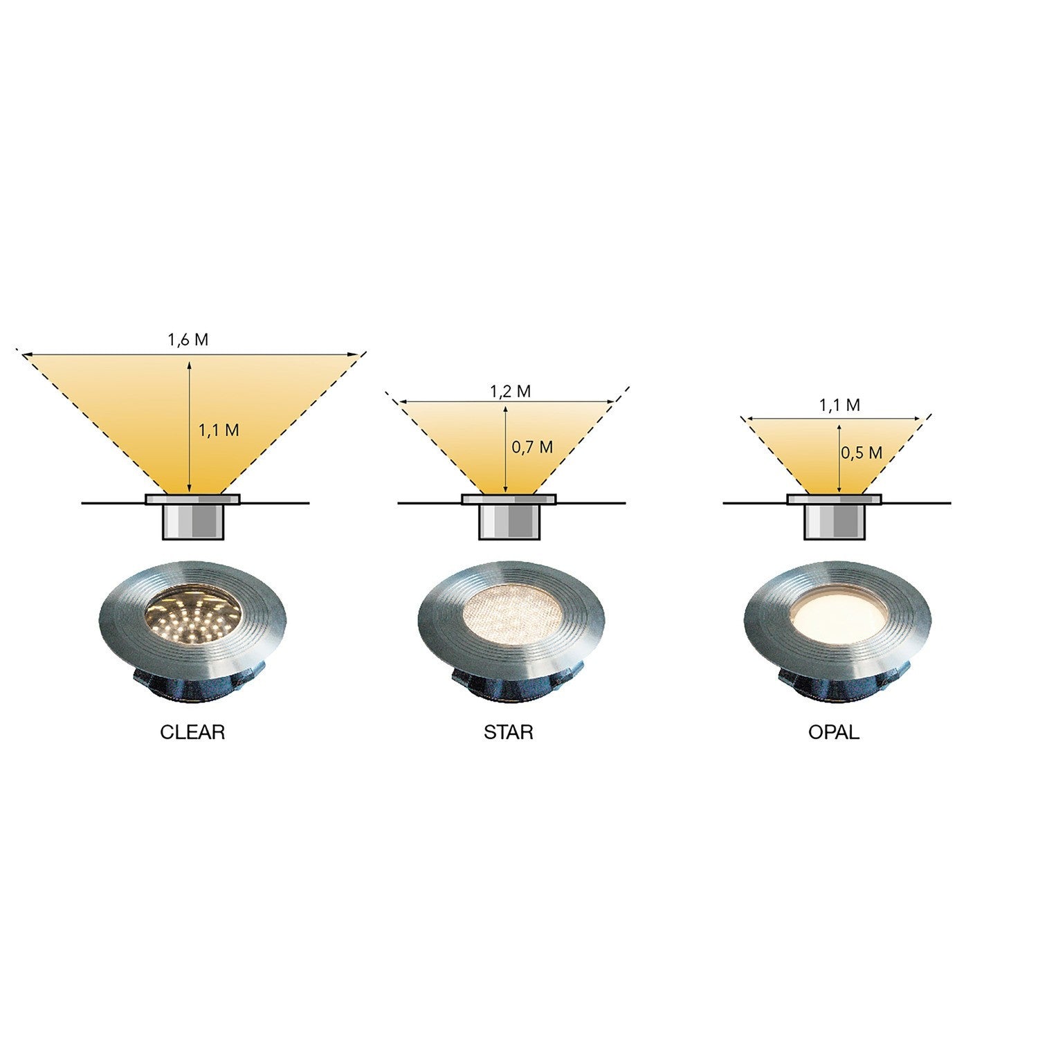 The Lightpro Onyx 90 R1 IP67 Decking Light features a warm, white light source and an aluminum construction, measuring at 10.5 cm. This makes it the perfect choice for accent lighting, with a low consumption of 1.5W. The product comes with a standard milk glass and a honeycomb that allows for customization of the desired lighting effect. For a smaller version, you can also check out the Onyx 60 R1.